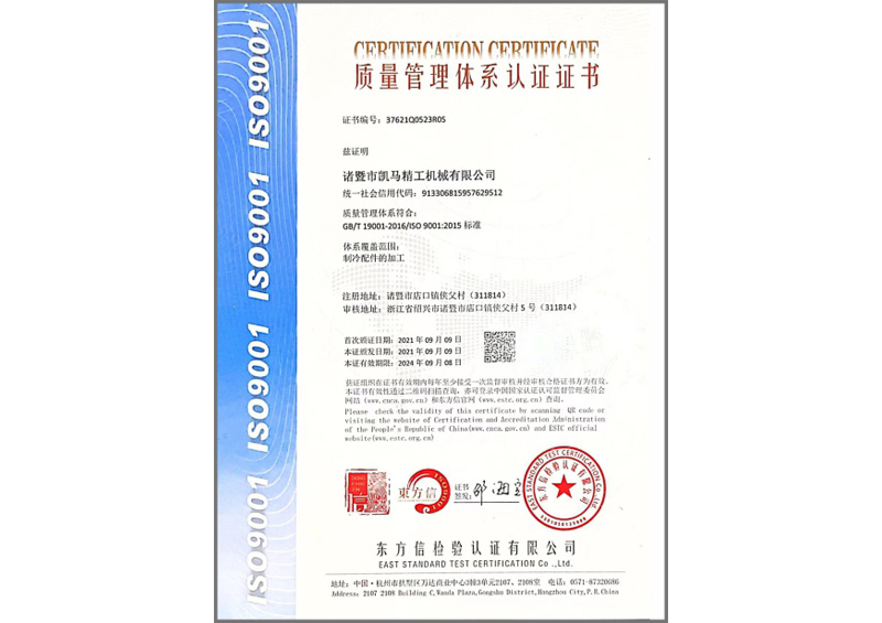 諸暨市凱馬精工機械有限公司創辦于2012年5月,現坐落在諸暨市店口鎮三江口工業區,注冊資金5000萬元,專業配套國內知名品牌空調廠家。隨著公司發展,知名客戶逐漸增多,與美的,格力,海爾,TCL,三花集團,海亮集團、盾安集團等上市公司陸續合作。通過3年的發展,我公司取得了ISO9001質量管理體系證書、ISO14001環境管理體系證書。